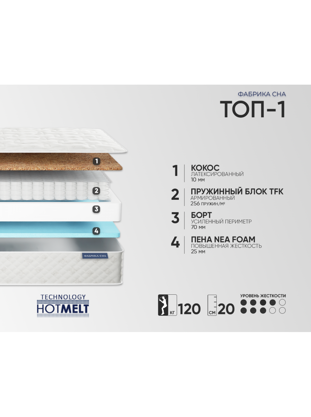 5. Евро периметр Система жесткого периметра матраса выполнена из пены высокой плотности. Располагается внутри матраса, создает идеальную форму его боковой части и дополнительно повышает жесткость краев, защищая их от проседания при нагрузках.