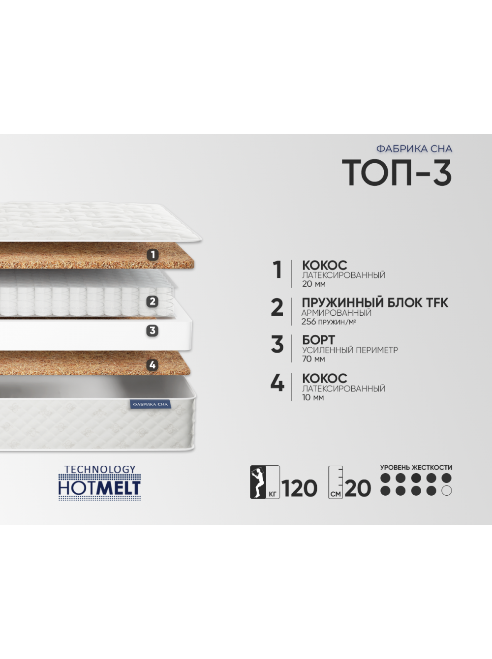 5. Евро периметр Система жесткого периметра матраса выполнена из пены высокой плотности. Располагается внутри матраса, создает идеальную форму его боковой части и дополнительно повышает жесткость краев, защищая их от проседания при нагрузках.